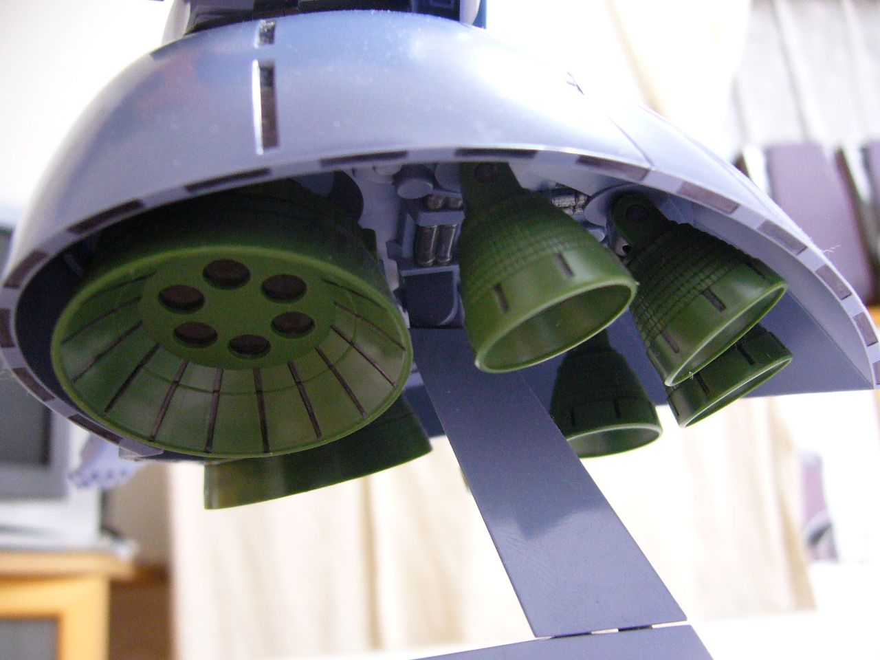 スカートの下をのぞき見ると、意外にもしっかりとディティールが仕込まれています。バーニアの数がすごい。